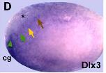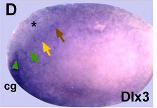 dlx3 (distal-less homeobox 3) gene expression in Xenopus laevis embryo, NF stage 13-14, assayed by in situ hybridization, lateral view, anterior left, dorsal up. Black asterisk indicates region where dlx3 is expressed only in the superficial ectodermal layer.; cg=cement gland primordium; coloured arrows indicate other placodes with no dlx3 expresssion. |