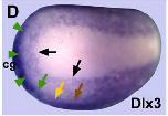 dlx3 (distal-less homeobox 3) gene expression in Xenopus laevis embryo, NF stage 13-14, assayed by in situ hybridization, dorsal view, anterior left. Black arrows indicate dlx3 expression in superficial ectoderm; cg=cement gland primordium. |