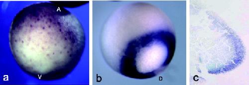Fig. 1. Expression of AmVegT in axolotl early embryos. (a) Late blastula. Individual cells in the marginal zone expressed AmVegT. Animal pole â A, Vegetal pole âV. (b) Gastrula. AmVegT was expressed in cells surrounding the area where the blastoporal lip forms. There was distinctly less expression at the dorsal lip (D) itself. (c) Gastrula section. A section through the blastoporal lip showed staining in the surface cells.