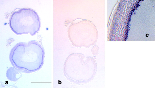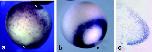 Fig. 4. Expression of AmVegT in ovarian oocytes. (a) Early vitellogenic oocytes hybridized with an antisense AmVegT probe. The clear area in the center of the oocytes is the germinal vesicle. It is surrounded by central cytoplasm, lacking yolk platelets, and then a thin layer of yolk-filled cytoplasm. There is stain throughout the cytoplasm, with a concentration at the boundary between the central cytoplasm and the yolk-filled cytoplasm. (b) An adjacent section hybridized with a sense probe has little stain. (c) Enlargement of the boundary between the central and the yolk-filled cytoplasm. Scale bar: 300 μm for (a) and (b); 50 μm for (c).