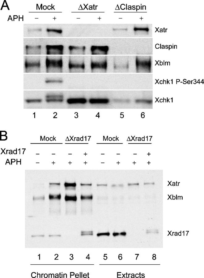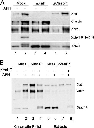 Figure 2. Xatr and Xrad17, but not Claspin, are required for phosphorylation of Xblm. (A) Extracts were treated with control (lanes 1 and 2), anti-Xatr (lanes 3 and 4), or anti-Claspin (lanes 5 and 6) antibodies. Sperm chromatin was incubated in extracts for 90 min in the absence (lanes 1, 3, and 5) or presence (lanes 2, 4, and 6) of aphidicolin. Nuclear fractions were isolated and immunoblotted for Xatr, Claspin, Xblm, Xchk1, and P-Ser344 of Xchk1. (B) Extracts were treated with control (lanes 1, 2, 5, and 6) or anti-Xrad17 (lanes 3, 4, 7, and 8) antibodies. Sperm chromatin was incubated in extracts for 90 min in the absence (lanes 1 and 5) or presence (lanes 2–4 and 6–8) of aphidicolin. His6-Xrad17 was added back to some extracts (lanes 4 and 8). Chromatin fractions and whole-extract aliquots were immunoblotted for Xatr, Xblm, and Xrad17. |