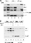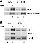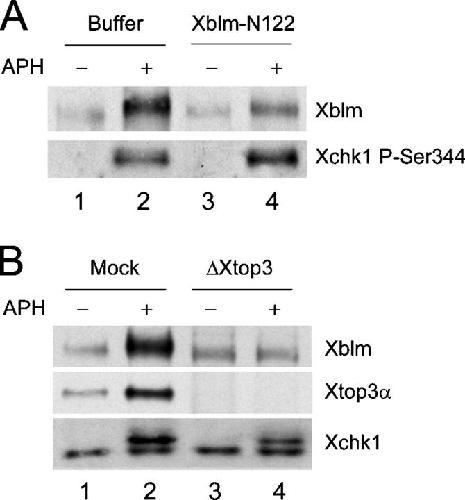 Figure 6. Phosphorylation of Xblm depends on association with Xtop3α. (A) Buffer alone (lanes 1 and 2) or Xblm-N122 (100 μg/μl; lanes 3 and 4) was added to extracts lacking (lanes 1 and 3) or containing (lanes 2 and 4) aphidicolin. After 90 min, nuclear fractions were isolated and immunoblotted with antibodies against Xblm and P-Ser344 of Xchk1. (B) Mock-depleted (lanes 1 and 2) and Xtop3α-depleted (lanes 3 and 4) extracts were incubated with sperm chromatin in the absence (lanes 1 and 3) or presence (lanes 2 and 4) of aphidicolin. After 90 min, nuclear fractions were isolated and immunoblotted with antibodies against Xblm, Xtop3α, and the whole Xchk1 protein. |