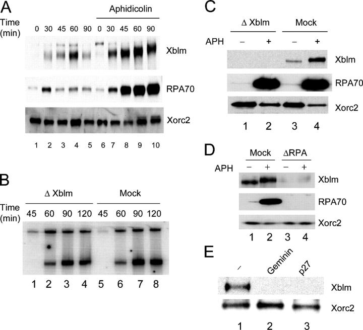 Figure 7. Xblm associates with replicating chromatin, but is not essential for DNA replication. (A) Sperm chromatin was incubated in egg extracts in the absence (lanes 1â5) or presence (lanes 6â10) of aphidicolin. At various times, chromatin fractions were isolated and immunoblotted for Xblm, RPA70, and Xorc2. (B) Xblm-depleted (lanes 1â4) and mock-depleted (lanes 5â8) egg extracts were incubated with sperm chromatin. Chromosomal DNA replication was assayed as described in the Materials and methods. The two bands in each lane depict 32P incorporation into chromosomal DNA. (C) Xblm-depleted (lanes 1 and 2) and mock-depleted (lanes 3 and 4) extracts were incubated with sperm chromatin in the absence (lanes 1 and 3) or presence (lanes 2 and 4) of aphidicolin. Chromatin fractions were isolated and immunoblotted for Xblm, RPA70, and Xorc2. (D) Mock-depleted (lanes 1 and 2) and RPA70-depleted (lanes 3 and 4) extracts were incubated with sperm chromatin in the absence (lanes 1 and 3) or presence (lanes 2 and 4) of aphidicolin. Chromatin fractions were isolated and immunoblotted for Xblm, RPA70, and Xorc2. (E) Extracts were left untreated (lane 1) or were treated with either geminin (lane 2) or p27 (lane 3) as described previously (Lee et al., 2003), and sperm chromatin was added. After 90 min, chromatin fractions were immunoblotted for Xblm (top) and Xorc2 (bottom). |