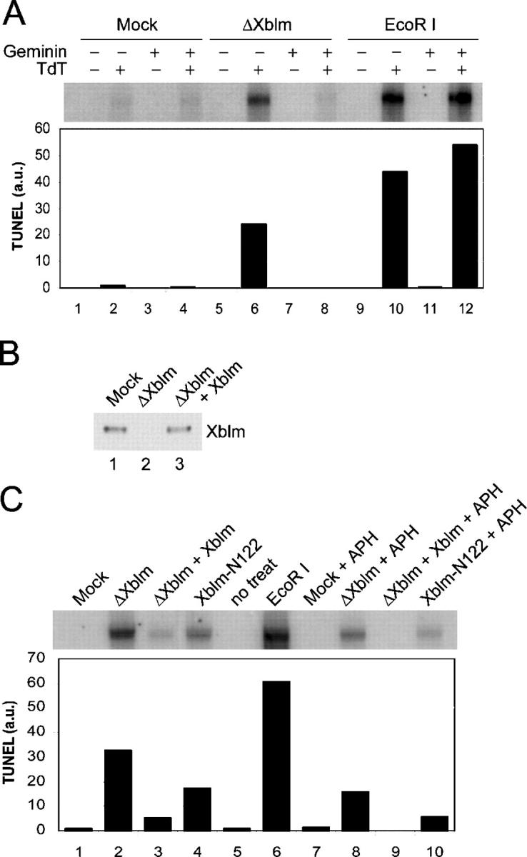 Figure 8. Xblm is required for preventing accumulation of chromosomal breaks during normal and disrupted S phases. (A) Extracts were treated with control antibodies (lanes 1–4), anti-Xblm antibodies (lanes 5–8), or no antibodies (lanes 9–12) and were incubated with sperm chromatin. Some extracts were treated with 0.1 U/μl EcoRI (lanes 9–12) and geminin (lanes 3, 4, 7, 8, 11, and 12). After 2 h, TUNEL assays were performed in the presence (lanes 2, 4, 6, 8, 10, and 12) or absence (lanes 1, 3, 5, 7, 9, and 11) of TdT. Samples were subjected to agarose gel electrophoresis and phosphorimaging (top). The radioactivity in each band was quantitated (bottom). (B) Mock-depleted (lane 1) and Xblm-depleted (lanes 2 and 3) extracts were prepared. Recombinant Xblm was made in the TnT® system and added back to an Xblm-depleted extract (lane 3). Samples were immunoblotted for Xblm. (C) Extracts were treated with control antibodies (lanes 1 and 7), anti-Xblm antibodies (lanes 2, 3, 8, and 9), or no antibodies (lanes 4, 5, 6, and 10) and were incubated with sperm chromatin. The reactions also contained 100 μg/ml Xblm-N122 (lanes 4 and 10), 0.1 U/μl EcoRI (lane 6), and aphidicolin (lanes 7–10). Full-length recombinant Xblm was added to some samples (lanes 3 and 9). After 2 h, TUNEL assays were performed as in A. |