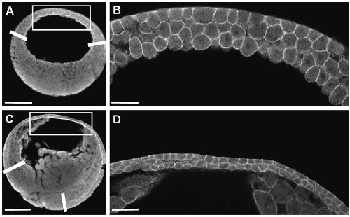 Fig. 1. The BCR thins during gastrulation. Confocal micrographs of bisected early (Stage 9, A and B) and late (Stage 11.5, C and D) Xenopus laevis gastrula