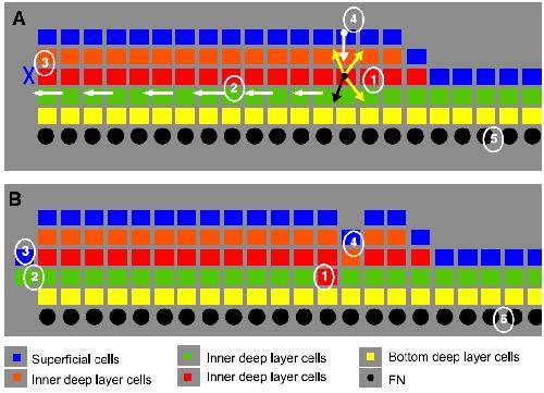 diameter to the left, (3) the superficial cell layer extends (spreads) to cover the protruding green cell layer, (4) an orange deep cell drops down to fill the gap