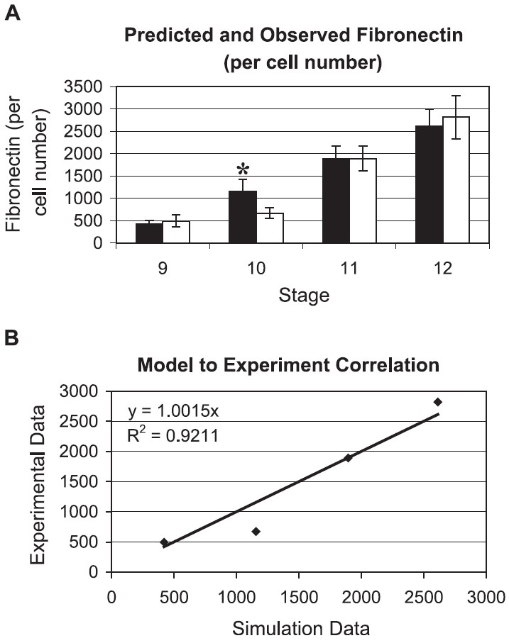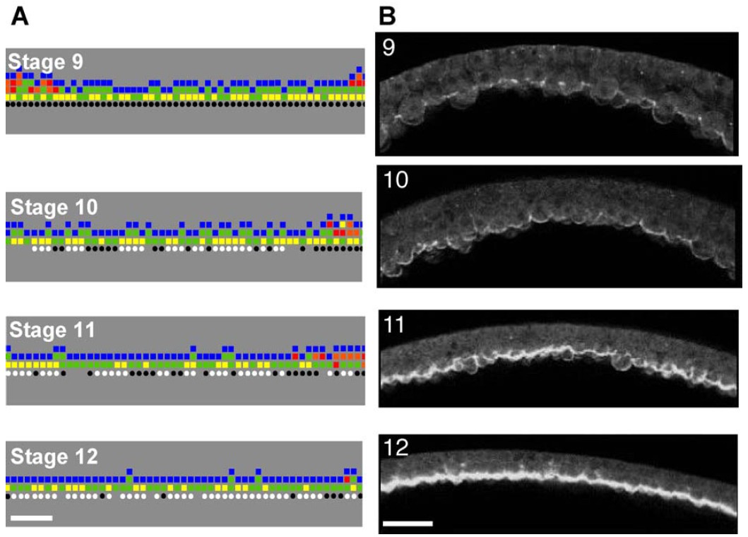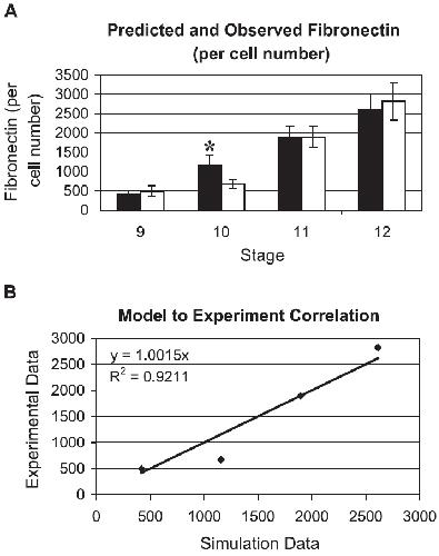 Fig. 5. The Model Predicts FN Matrix Assembly. (A) CA simulation prediction of FN intensity at stages 9, 10, 11, and 12 (scale bar = 100 Am). The bottom layer in the model is a grayscale representation of FN intensity. Black corresponds to negligible FN and white corresponds to the highest relative value of FN. (B) Photomicrographs of the BCR roof at stages 9, 10, 11, and 12 (scale bar = 100 Am). Bright white areas indicate high levels of FN. At each time point, the FN content is homogeneous and uniform across the entire area of the BCR; therefore, the sections in (B) are representative of the entire BCR area, in terms of FN content.