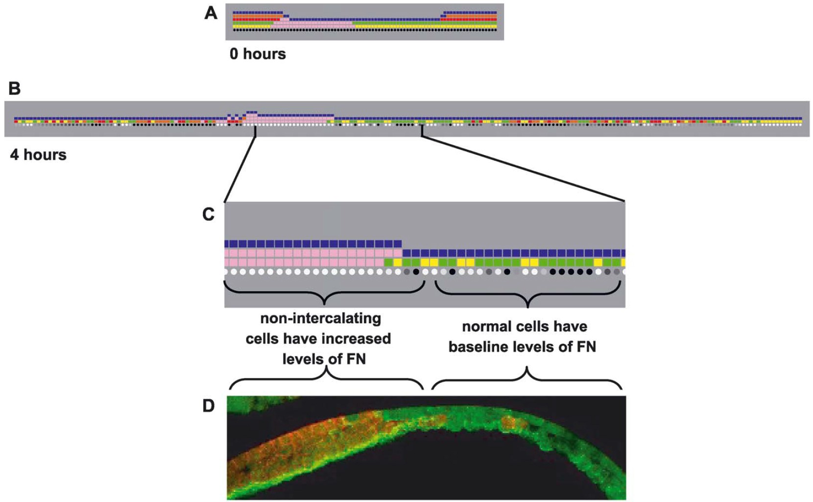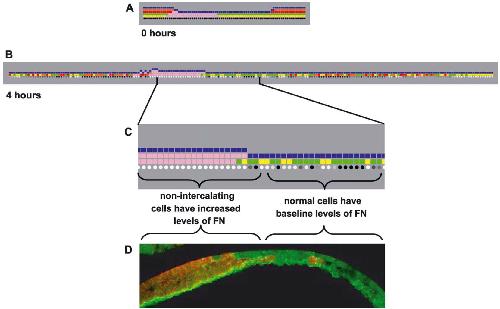 created by the intercalated red cell. The superficial cell layer conforms to fill the gap created by the orange cell, (5) the FN intensity associated with each bottom