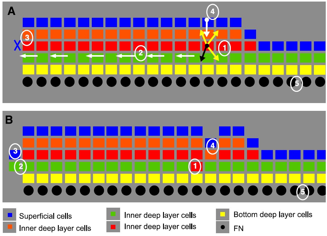 (yellow) deep layer cell is incremented if the residency time and cell-to-cell contact criteria are met. (B) The tissue geometry after the events described in (A)