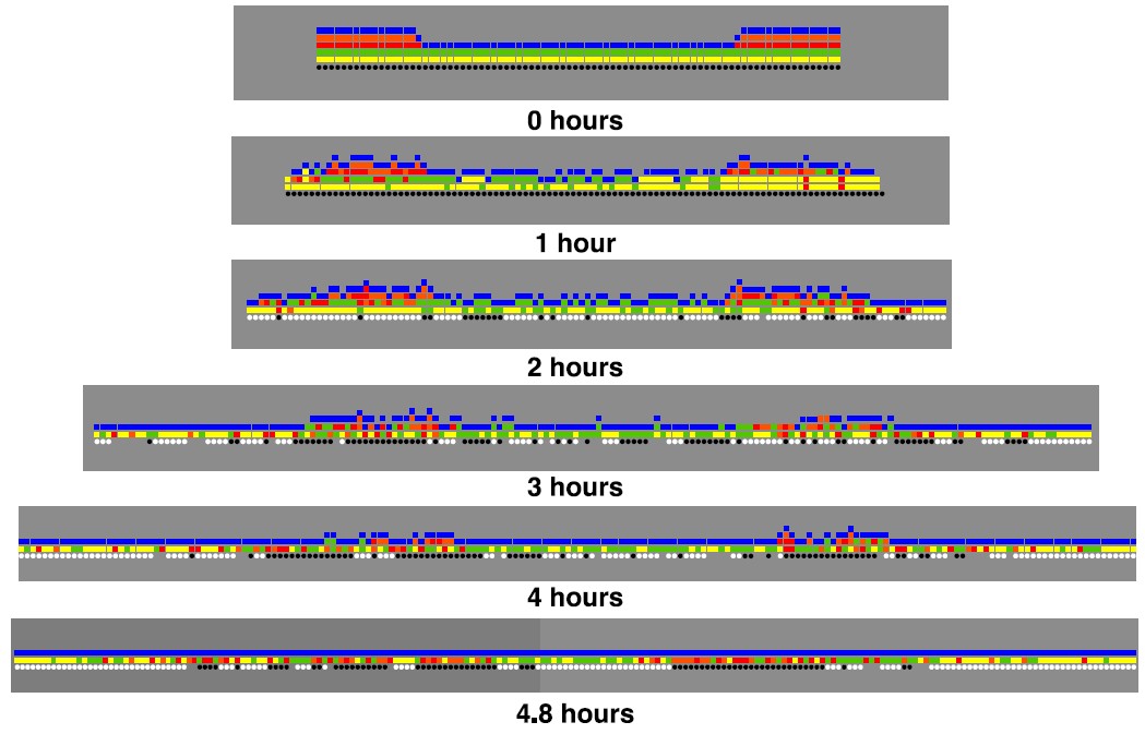Fig. 3. Time sequence of the simulated process of BCR thinning in the Xenopus laevis embryo. The model begins with multiple cell layers and terminates when
