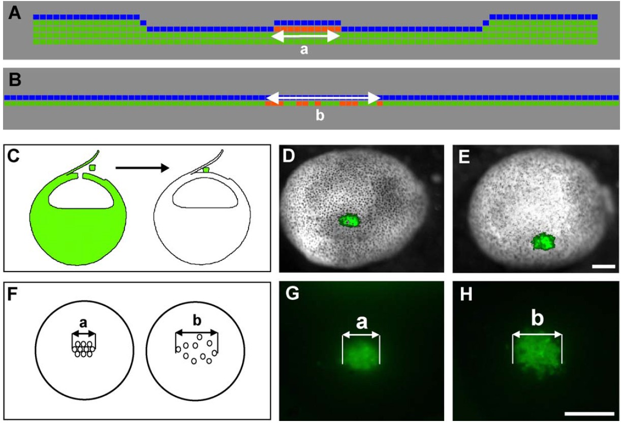distance between the end cells, late in stage 8/early in stage 9 is represented by a. The simulation predicts the spatial fate of the implanted cells 5 h later (B).