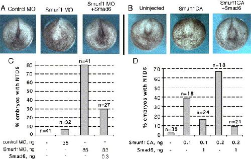 Fig. 9. A Smad1/5 antagonist, Smad6, rescues the Smurf1 knockdown phenotype. (A, B) Representative stage 18 (A) and stage 17 (B) embryos. (C, D) Summary of Smurf1 MO (C) and Smurf1CA (D) rescue by Smad6 (nânumber of embryos). |