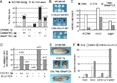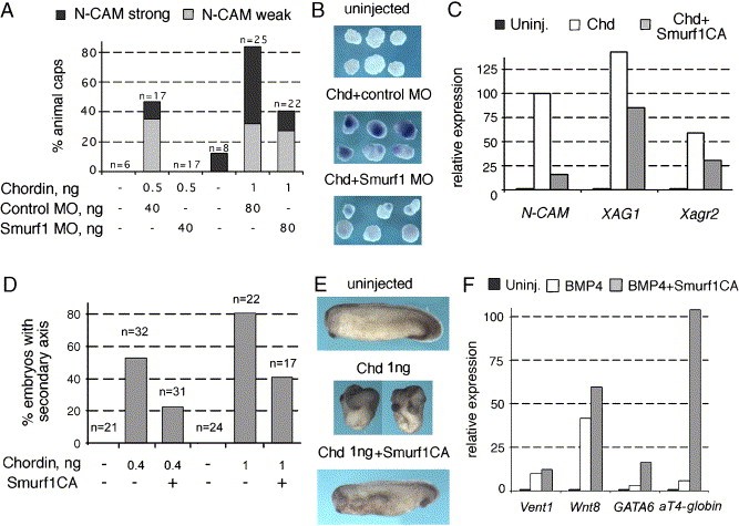 Fig. 10. Blocking Smurf1 inhibits response to Chordin and enhances response to BMP. (A, B) Smurf1 MO, but not control MO, blocks neural induction by Chordin in animal caps, as scored by in situ hybridization with N-CAM probe. (A) Combined data from two experiments (nânumber of animal caps), (B) representative animal caps from each treatment. (C) Similarly, Smurf1CA suppresses expression of N-CAM and two cement gland markers, XAG1 and Xagr2, in Chordin mRNA-injected animal caps, as measured by quantitative RT-PCR at stage 25. (D) Smurf1CA also inhibits secondary axis induction by Chordin mRNA injected in the ventral marginal zone (nânumber of embryos). (E) Likewise, embryos injected with 1 ng Chordin mRNA in the animal pole are strongly dorsalized, which is reversed by co-injection of Smurf1CA mRNA. (F) Quantitative RT-PCR on animal caps injected with BMP4 mRNA, with or without Smurf1CA. Expression of both early (Vent1 and Wnt8, scored at stage 10.5) and late BMP4 target genes (GATA6 and αT4-globin, scored at stage 25) is enhanced by Smurf1CA. Panels C and F were repeated twice on independent cDNA with similar results. |