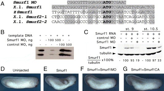Fig. 2. Characterization of Smurf1 MO and Smurf1CA effectiveness. (A) Alignment of Smurf1 MO sequence with Xenopus laevis (X.l.) Smurf1, zebrafish Danio rerio Smurf1 (zSmurf1) and two versions of X. laevis Smurf2. The translation start site is in bold. (B, C) The amount of Smurf1 protein produced by in vitro translation (B) or in the embryos injected with Smurf1 mRNA (C) is reduced in the presence of Smurf1 MO, but not control MO. (DâG) Smurf1 MO (F) and Smurf1CA (G) block secondary axis induction by the wild-type Smurf1 (E). |