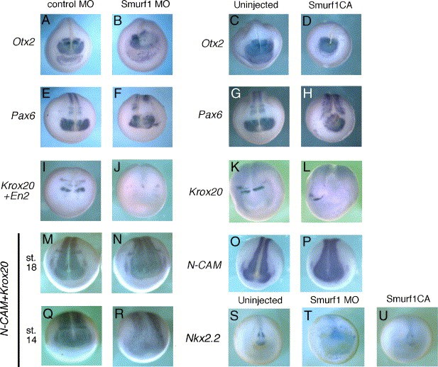 Fig. 5. Smurf1 knockdown disrupts neural gene expression. Anterior neural marker Otx2 (AâD), prospective eye marker Pax6 (EâH), rhombomere 3 and 5 marker Krox20 and the marker of mid-hindbrain boundary En2 (IâL) at late neurula stage 18. Pan-neural marker N-CAM at stage 18 (MâP) and stage 14 (Q, R). (SâU) Shh target gene in the neural plate, Nkx2.2, at stage 17. All are anterior views. |
