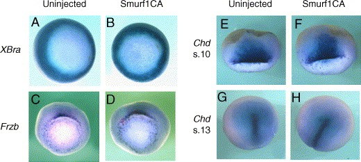 Fig. 7. Mesodermal markers are not affected by blocking Smurf1. General mesodermal marker XBra (A, B), the marker of the prospective head mesoderm Frzb (C, D) and the marker of the Organizer and notochord Chd (EâH) are expressed normally in Smurf1CA embryos. (AâD) Vegetal view, dorsal side up. (EâH) Dorsal view, animal pole up. Representative embryos are shown. |