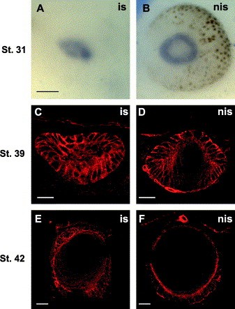 Fig. 8. Depletion of Xcadherin-6 disturbs lens development. (A) In situ hybridization of Xcadherin-6 depleted embryos demonstrates a reduction in the expression of the lens marker gene Pitx-3 on the injected side in stage 31 embryos. (C) Staining for β1-integrin shows the organization of lens fiber cells. On the injected side the cells are not properly arranged. nis, not injected side; is, injected side. Scale bars in (A, B): 50 μm, in (C): 10 μm.