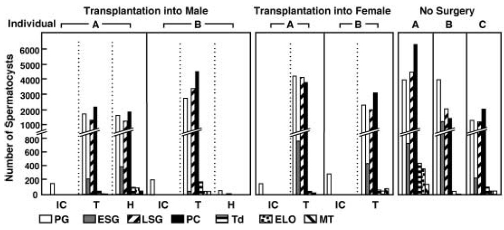 spermatogonia (ESG), late-secondary spermatogonia (LSG), and primary spermatocytes (PC) between the testis cultured in the