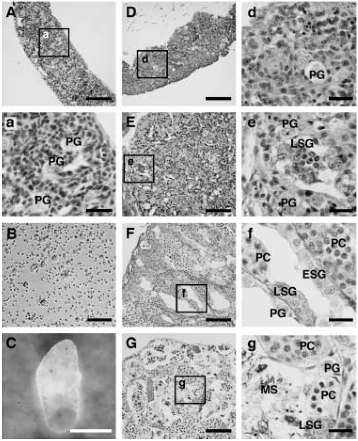 Dissociated testicular cells. (C, D, d) An aggregate prepared by