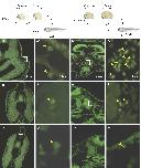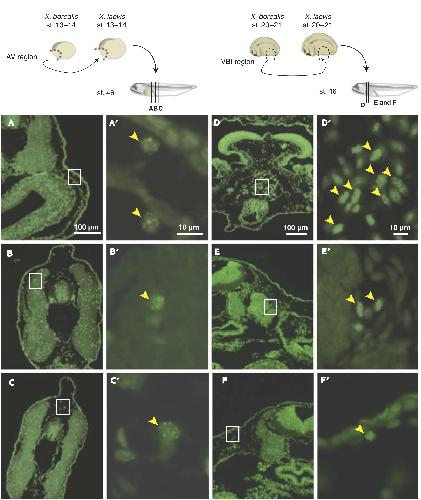 Fig. 3. Distribution of anterior ventral (AV)- and ventral blood island (VBI)-derived cells in the mesenchyme and peripheral blood at the early tadpole stage. The AV regions of Xenopus borealis embryos at stage 13â14 were excised and orthotopically transplanted into Xenopus laevis embryos. As a control experiment, the VBI regions of borealis embryos at stage 20â21 were transplanted. The host embryos were allowed to develop until appropriate stages and were fixed for histological examination to detect borealis (donor) cells. (AâF) Quinacrine-stained sections of AV-grafted animals (AâC) and VBI-grafted animals (DâF) at stage 46. AââFâ are high magnification views of AâF. Borealis nuclei have brightly stained spots after staining with quinacrine (arrowheads in AââFâ). Significant numbers of borealis cells were observed in the mesenchyme near the epidermis (A, Aâ), the spinal cord (C, Câ) and in the somite (B, Bâ) of AV-grafted animals. In contrast, many borealis cells were observed in the heart (D, Dâ), blood vessels (E, Eâ) and mesenchyme (F, Fâ) of VBI-grafted animals. |