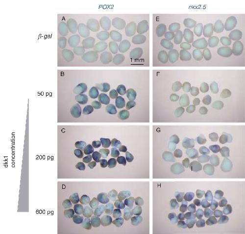 Fig.6. Dose-dependent induc- tion of peroxidase 2 (POX2) and nkx2.5 in ventral marginal zone (VMZ) explants after injection of dkk1 mRNA. Prospective VMZ at the 4-cell stage injected with dkk1 mRNA. VMZ explants excised at the early gastrula stage were cultured until stage 28 and processed for whole-mount in situ hybridization analysis. Expression of POX2 (A–D) and nkx2.5 (E-H) was examined in cultured VMZ explants that had been injected with 300 pg β-gal (A, E), 50 pg dkk1 (B, F), 200 pg dkk1 (C, G) or 600 pg dkk1 (D, H) mRNA. Expression of POX2 was induced at a low dose of dkk1 RNA, whereas nkx2.5 was induced at a high dose of dkk1 RNA. |