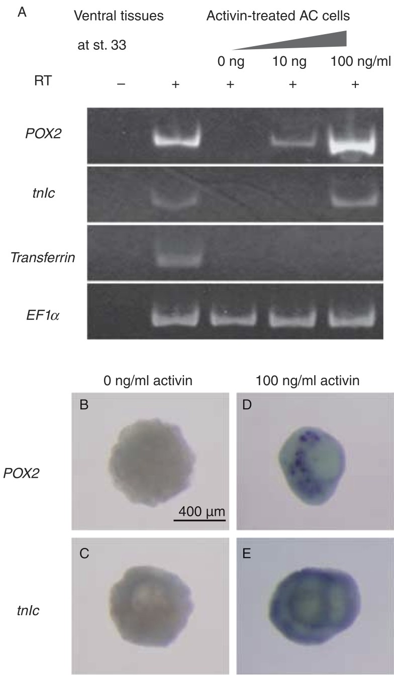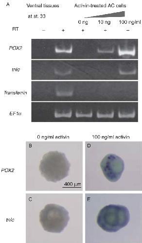 Induction of peroxidase 2 (POX2) in animal cap explants. The animal cap was excised from a mid-blastula embryo, and cells were dissociated in a Ca2+-free medium for 20 min and then reaggregated in the medium containing activin, as described previously (Ariizumi et al. 2003). Aggregates were further cultured until stage 33 and fixed to process for reverse transcription-polymerase chain reaction (RT-PCR) and whole- mount in situ hybridization analyses. (A) Expression of POX2, tnIc (a heart marker), transferrin (a liver marker) and EF1α (loading control) was examined by RT-PCR analysis. POX2 expression was strongly induced in the explants treated with 100 ng/mL activin. The explants also expressed tnIc but did not express transferrin. (B–E) Expression of POX2 and tnIc was examined by whole-mount in situ hybridization analysis. |