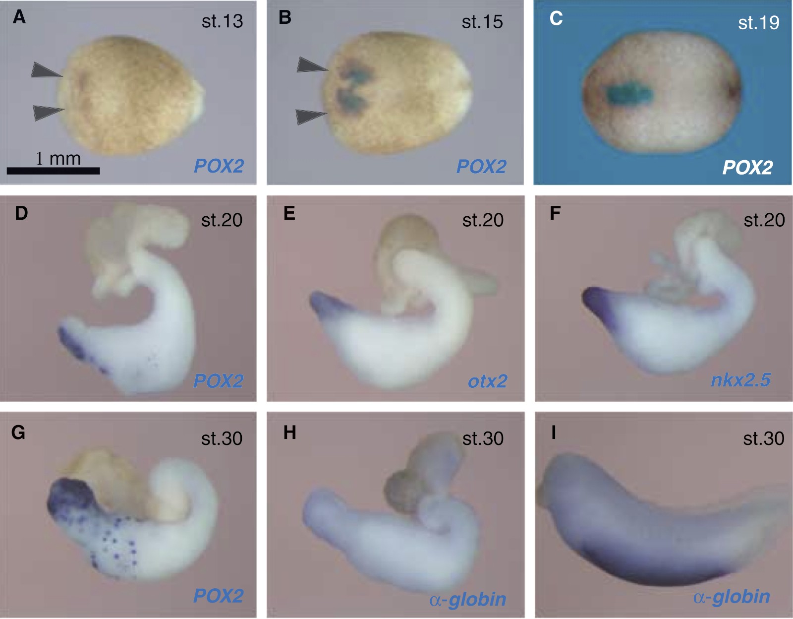 Fig. 1. Expression of peroxidase 2 (POX2) in normal and exogastrula embryos (A–C). Whole-mount in situ hybridization analysis at the neurula stage (stage 13 and stage 15) (A and B) and early tailbud stage (stage 19) (C), showing that expression of POX2 starts in the two separated portions of the anterior ventral region (arrowheads in 1A and 1B). (D–I) Expression of POX2 (D, G), otx2 (E), nkx2.5 (F) and α-globin (H) in exogastrula embryos. The exogastula embryos were made as described in the Materials and methods section, and these embryos were cultured until stage 20 (D, E, F) or stage 30 (G, H). The expression of α-globin in a control stage 30 embryo is shown in I. The POX2 message was localized in the anterior mesoderm where otx-2 and nkx2.5 were also located. |