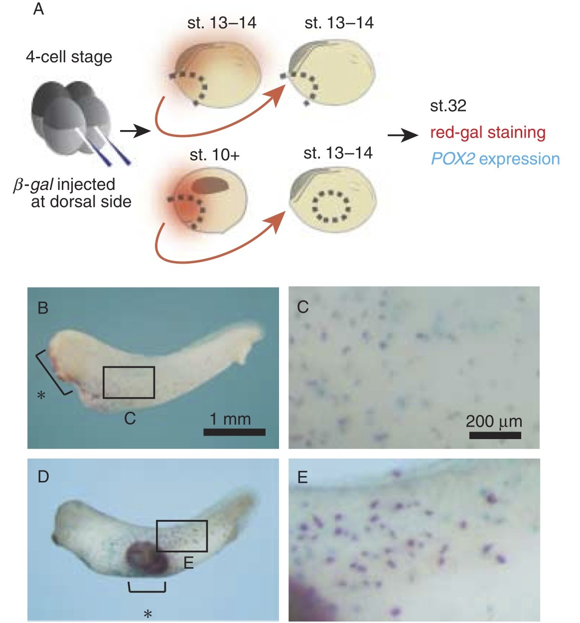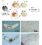 Distribution of anterior ventral (AV)-derived cells and dorsal marginal zone (DMZ)-derived cells in the embryos at the tailbud stage. (A) Beta-galactosidase (beta-gal) RNA (300 pg/embryo) was injected into the DMZ at the 4-cell stage. AV region at stage 13–14 or DMZ at stage 10+ was excised from the beta-gal-injected embryos and transplanted into stage 13–14 embryos. Host embryos were fixed at the tailbud stage (stage 32), stained with red-gal and subjected to whole-mount in situ hybridization analysis. A tailbud embryo (B, C) grafted with AV region (asterisk in B) and a tailbud embryo (D, E) grafted with DMZ region (asterisk in D), showing red-gal-positive cells (red) and peroxidase 2 (POX2)-positive cells (blue). Existence of double- positive cells (purple cells in C and E) in the lateral trunk region of the embryo revealed that a group of cells derived from the transplanted area migrated in the posterior direction and differentiated into POX2-positive leukocytes. |