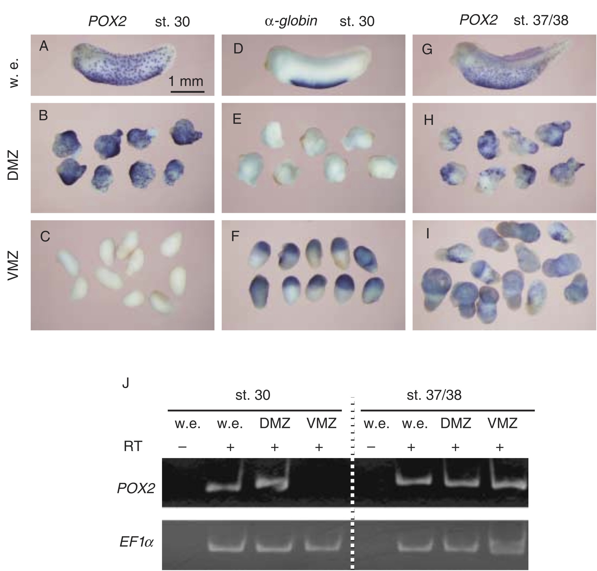 Fig. 4. Expression of peroxidase 2 (POX2) in dorsal marginal zone (DMZ) and ventral marginal zone (VMZ) explants. (A–I) Whole-mount in situ hybridization analysis showing the expression of POX2 (B, C, H, I) and α-globin (E, F) in DMZ (B, E, H) and VMZ (C, F, I) explants. Explants were harvested at stage 30 (B, C, E, F) or at stage 37/38 (H, I). Control whole embryos (w. e) are also shown (A, D, G). (J) Reverse transcription-polymerase chain reaction (RT-PCR) analysis. Explants and the control whole embryos (w. e) were harvested at stage 30 or stage 37/38 and processed for the RT-PCR analysis to show the expression of POX2 and EF1α. The results demonstrated that both the DMZ and VMZ explants contain leukocyte precursor cells, but only the cells in DMZ explants differentiate at the early stage (stage 30). |