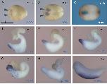 Fig.5. Induction of peroxidase 2 (POX2) expression in ventral marginal zone (VMZ) explants. Prospective VMZ at the 4-cell stage injected with mRNA coding for the BMP signal inhibitor and/or the wnt signal inhibitors. VMZ explants excised at the early gastrula stage were cultured until stage 28–30 and processed for whole-mount in situ hybridization analysis. Expression of POX2 (A–F), nkx2.5 (G), otx2 (H), α-globin (I) and LuRP (J, K) was examined in cultured VMZ explants that had been previously injected with β-gal (300 pg) (A), tBR (1000 pg) (B), tBR (1000 pg) + dkk1 (50 pg) (C), dkk1 (50 pg) (D, G, H, I, K), frzb-1 (800 pg) (E), or cerberus (600 pg) (F) mRNA. POX2 was strongly induced by dkk1 mRNA but was not induced by tBR mRNA. The VMZ explants injected with dkk1 mRNA did not express other anterior tissue markers, such as otx2 or nkx2.5. Instead, they expressed a ventral mesoderm marker, such as α- globin. Another leukocyte marker, LURP-1, was also strongly induced by dkk1 mRNA injection (50 pg) (J, K). L shows the expression of LURP-1 in stage 30 embryos. |