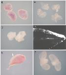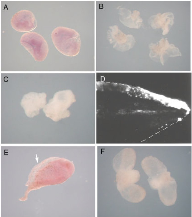 Fig. 3. Explant cocultures. A: Uninduced epidermis from alongside the neural folds and under the blastopore, extirpated at stage 13 and cultured until controls reached stage 40. See green and blue areas in Figure 2A. B: Lateral, ventral, and dorsal epidermis cocultured as a sandwich with neural folds. See green, blue, and pink areas, plus red area, in Figure 2A. Note the ruffles of fin induced around the explant. C: Lateral, ventral, and dorsal epidermis cocultured with lateralmesoderm and endoderm. See green, blue, and pink areas, plus underlying pink area in Figure 2A. No fin induction is observed. D: Fluorescein dextran amineabeled non-finepidermis grafted at stage 20 above the posterior neural tube and incorporated into the development of a normal dorsal fin by stage 40. Fin is outlined by dashed white line. E,F: Ventraltissue explanted at stage 13 and cultured until controls reached stage 40. See blue area in Figure 2A. Arrow in E points to fin-like structures. n 20 for A and B, n 30 for C and E.