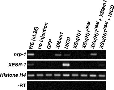 Fig. 6. XMam1-induced nrp-1 expression occurs without Notch signaling. To test the inductive effect of XMam1 in vitro, 1 ng of samples were injected into animal poles of both blastomeres at the 2-cell stage. The animal caps isolated at st. 8 were cultured to st. 25 and gene expression was analyzed by RT-PCR using nrp-1 and XESR-1 primers. Both XMam1 and NICD induced nrp-1 in animal caps, although NICD induced weak expression of nrp-1. The nrp-1 induction by XMam1 was not inhibited by co-injection with X-Su(H)1DBM, whereas nrp-1 induction by NICD was completely suppressed by co-injection with X-Su(H)1DBM. Gene expres- sion of XESR-1 was induced by NICD but not by XMam1. GFP was used as a tracer for microinjection. Ectopic gene expression was not induced by injecting with GFP, XSu(H)1 nor X-Su(H)1DBM. Histone H4 was used as an internal control. WE, whole embryo.