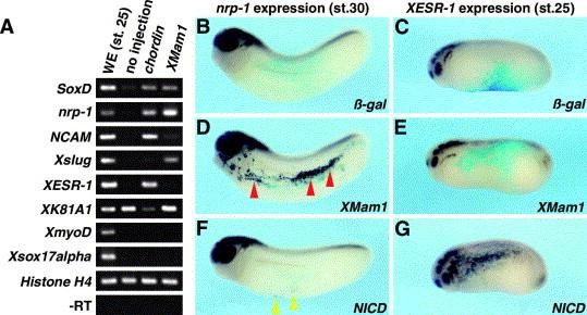 Fig. 4. XMam1 induces neural marker genes in animal caps and generates nrp-1-positive cells in vivo. (A) Gene expression induced by XMam1. XMam1 was injected into both blastomeres of 2-cell stage embryos and animal caps were dissected at st. 8. The expression of various gene markers was analyzed by RT-PCR at st. 25. Chordin and Histone H4 were used as positive and loading controls, respectively. XMam1 activated the transcription of SoxD, nrp-1, Xslug and NCAM, but did not transactivate XESR-1, XmyoD or Xsox17alpha. Chordin also induced SoxD, nrp-1 and NCAM expression. Gene expression of epidermal marker, XK81A1 was suppressed by Chordin, but not by XMam1. WE; whole embryo. (B, D, and F) Ectopic gene expression of nrp-1 induced by β-galactosidase (B), XMam1 (C) or NICD (D). Microinjection into one ventroanimal blastomere was performed at the 8-cell stage and nrp-1 expression was analyzed at st. 30. Ectopic expression of nrp-1 was induced by XMam1 (D, red arrowheads). NICD-injected embryos ectopically showed a weak expression of nrp-1 (F, yellow arrowheads). (C, E, and G) Ectopic gene expression of XESR-1 induced by β-galactosidase (C), XMam1 (E) or NICD (G). To examine whether XMam1-induced neural gene expression occurs via the transactivation of XESR-1, 2 ng of β-galactosidase (C), XMam1 (E) or NICD (G) was injected into one ventroanimal blastomere of 8-cell stage embryos and XESR-1 expression was analyzed at st. 25 by whole-mount in situ hybridization. Injected region was colored blue by β-galactosidase staining. NICD caused the ectopic expression of XESR-1, whereas other samples did not.