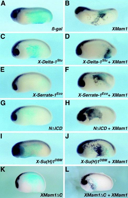 Fig. 5. XMam1 induces the ectopic expression of nrp-1 under inhibitory conditions of Notch signaling. To examine whether XMam1 can induce nrp-1 expression under the inhibitory conditions of Notch signaling, XMam1 was injected with or without the dominant-negative form of Notch signaling molecules into one ventroanimal blastomere of 8-cell stage embryos, and nrp-1 expression was analyzed at st. 25 by whole-mount in situ hybridization. Injected region was colored blue by β-galactosidase staining. (A) Control embryo. (BâL) Embryo injected with XMam1 (B), X-Delta-1Stu (C), X-Delta-1Stu and XMam1 (D), X-Serrate-1Eco (E), X-Serrate-1Eco and XMam1 (F), NδICD (G), NδICD and XMam1 (H), X-Su(H)1DBM (I), X-Su(H)1DBM and XMam1 (J), XMam1δC (K), XMam1δC and XMam1 (L). Ectopic nrp-1 expression was detected in the embryo injected with XMam1, regardless of the inhibition of Notch signaling.