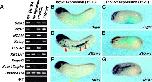 Fig. 7. XMam1δN is not involved in Notch signaling. To confirm that XMam1δN is not involved in Notch signaling, we examined whether XMam1δN could rescue the down-regulation of XESR-1 transcription caused by XMam1δC. Samples were injected into one blastomere of 2-cell stage embryos and XESR-1 expression was analyzed at st. 14 by RT-PCR (A) or by whole-mount in situ hybridization (BâE). XESR-1 expression was suppressed by injecting with XMam1δC (AâC). The suppression of XESR-1 expression by XMam1δC could be rescued by co-injecting with XMam1 (A and D), but not with XMam1δN (A and E). Black rectangles in BâE represent the injected side. The injected region was colored blue by β-galactosidase staining.