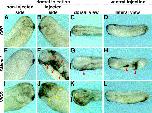 Fig. 2. Overexpression of XMam1 generates hyperpigmented cell mass. To examine the role of XMam1 in early development, 2 ng of GFP (AâD), XMam1 (EâH) and NICD (IâL) were injected into one dorso- or ventroanimal blastomere at the 8-cell stage and the phenotype was observed. (A, E, and I) Control side. (B, F, and J) Injected dorsal side. (C, G, and K) Dorsal view of the embryo injected into dorsal side. Black rectangles represent injected side. (D, H, and L) Lateral view of the embryo injected into ventral side. XMam1 generated a cell mass with pigmentation in embryos injected on both dorsal and ventral sides (red arrowheads). Embryos injected with NICD into dorsal side showed brain enlargement (yellow arrowheads)