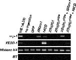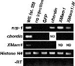 Fig. 8. XMam1 induces nrp-1 expression in a Notch-independent manner. To test whether XMam1 is able to induce nrp-1 expression without interaction with Notch signaling molecules, XMam1DN was injected into both blastomeres of 2-cell stage embryos. Animal caps were dissected from the injected embryo and gene expression was analyzed at st. 25 by RT- PCR. XMam1DN induced nrp-1 expression as well as XMam1 without the ectopic gene expression of chordin. Chordin also induced nrp-1 expression without the gene expression of XMam1. GFP was used as the tracer for microinjection. Histone H4 was used as an internal control. WE, whole embryo; ND, no data.