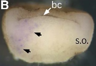 admp2 (antidorsalizing morphogenetic protein 2) gene expression in bissected Xenopus laevis embryo, assayed via in situ hybridization, NF stage 10, horizontal view, dorsal right