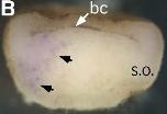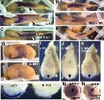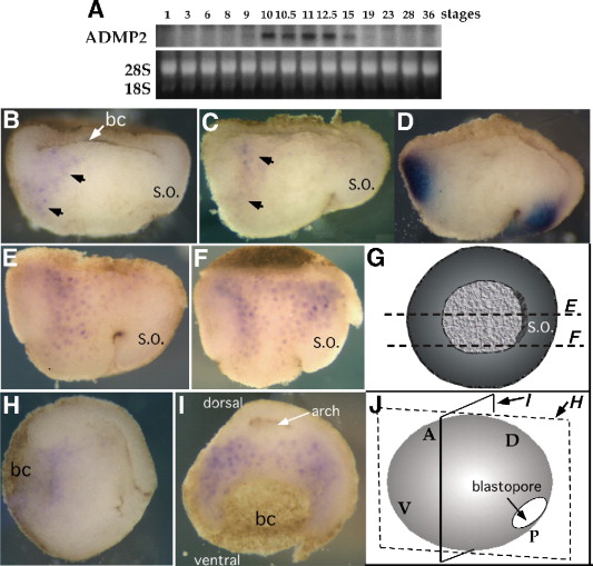 Fig. 2. Expression of ADMP2. (A) Expression of ADMP2 by Northern blotting of RNA from staged Xenopus embryos. Expression was first seen at stage 9 and persisted through the early neurula stage. Ethidium staining for 28S and 18S RNAs serves as a loading control. (B) In situ hybridization for ADMP2 in stage 10 embryo bisected sagittally. Arrows indicate general region of specific hybridization. (C and D) Two halves of bisected stage 10.5 embryo hybridized with either ADMP2 (C), or brachyury (D) (for the benefit of comparison, one image is inverted). (E and F) Sagittal (E) and para-sagittal (F) sections of stage 11 embryos hybridized for ADMP2. (G) Vegetal view of schematic stage 11 embryo indicating the approximate lines of bisection of embryos in panels E and F. (H and I) Stage 12 embryos hybridized for ADMP2. Dorsal is up and ventral is down for both embryos. Panel H shows sagittal section, while panel I shows transverse section. (J) Schematic view of stage 12 embryo showing the approximate plans of view in panels H and I. S.O.: approximate position of the Spemann organizer. bc: position of the blastocel.