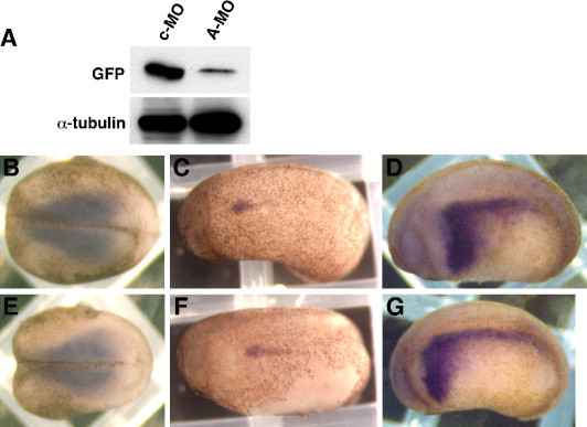 Fig. 5. (A) Inhibition of translation by an ADMP2 antisense morpholino oligonucleotide. Western blot of proteins extracted from stage 14 embryos that have been injected separately with 100Â pg of RNA encoding an ADMP2/GFP fusion protein and either 10Â ng of a control (c-MO) or antisense ADMP2 morpholino oligonucleotide (A-MO). Shown is the result of immunoblotting using an anti-GFP antibody and an anti-alpha-tubulin antibody (loading control). (BâG) Loss-of-function analysis of ADMP2. Control embryos (B, C, D), and embryos (E, F, G) injected with an antisense ADMP2 morpholino oligonucleotide (A-MO) probed for expression of a somite marker, XmyoD (B, E), a pronephros marker, Xlim1 (C, F) or a lateral plate marker, Xnr1 (D, G). (B, E) Stage 14 embryos. Anterior is to the left. Dorsal views. (C, D, F, G) Stage 24 embryos. Lateral views. Anterior to the left.