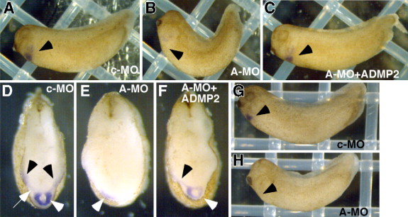 Fig. 6. Loss of ADMP2 and heart formation. (A and B) Injection of 10 ng of an antisense ADMP2 morpholino oligonucleotide into each of the two anterior blastomeres of a 4-cell stage embryo inhibited the expression of the heart marker Nkx2.5 (c-MO: control morpholino; A-MO: antisense ADMP2 morpholino). (C) This effect was reversed by co-injection of 5 pg of ADMP2 δ-5ⲠUTR RNA (total 10 pg) (black arrowheads). (D) Transverse sections of c-MO-injected embryos showed that Nkx2.5 was expressed in a tube of myocardium (white arrowheads) as well as the pericardial roof (black arrowheads in panel D). (E) A-MO-injected embryos, on the other hand, showed only faint expression of Nkx2.5 (white arrowhead in panel E), and the heart tube was not formed. (F) Rescue of the A-MO phenotype, as in panel C. (G, H) Anterior injection of 10 ng A-MO also reduced the expression of TnIC, another heart marker (black arrowhead in panel K compared to that in panel J) (82%; Table 1).