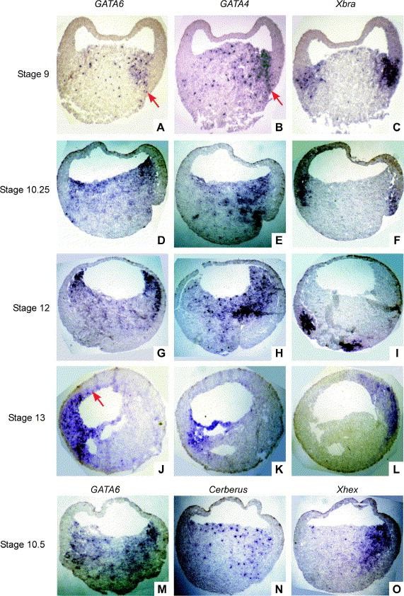 Fig. 1. GATA4 and GATA6 are expressed in migratory leading edge mesendoderm throughout gastrulation. (AâL) In situ hybridisation on embryos just prior to (stage 9), during (stages 10.25 and 12) and at the end of (stage 13) gastrulation. Serial sections were hybridised with probes for GATA6, GATA4 and the mesodermal marker Xbra. (MâO) In situ hybridisation showing coexpression of GATA6 with cerberus and Xhex (markers of leading edge mesendoderm) during gastrulation. The vegetal pole is to the bottom and dorsal is to the right in all panels except JâL, where dorsal is towards the top and anterior is left. Arrows in (A) and (B) denote suprablastoporal endoderm, where punctate staining is visible in a few cells. Arrow in (J) denotes archenteron roof. All sections are sagittal and 10 μm.
