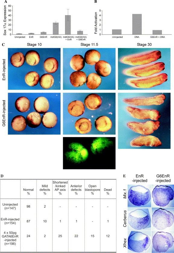 Fig. 3. Inhibition of GATA function disrupts gastrulation movements. (A) Induction of Sox17α by mdlGATA6 in animal caps is inhibited by myqGATA6EnR. Relative gene expression in animal caps at sib stage 12 measured by real-time RT-PCR. Fifty picograms of each RNA was injected into animal caps of one-cell embryos. This experiment was repeated twice giving similar results each time. (B) Transactivation of a GATA-driven luciferase reporter gene by endogenous factors in the marginal zone is inhibited by myqGATA6EnR. The marginal zone of each blastomere at the four-cell stage was injected with reporter DNA ±myqGATA6EnR mRNA. Luciferase activity is expressed as fold activation relative to background activity in uninjected embryos. This experiment was repeated twice giving similar results each time. (C and D) Inhibition of GATA function disrupts gastrulation movements and anterior development. (C) myqGATA6EnR-injected embryos display delayed gastrulation, poor head development and shortened anteriorposterior axes. Fluorescent image shows nlsGFP expression in a myqGATA6EnR-injected embryo (see bright-field image above) and demonstrates accurate targeting of the marginal zone. (D) Pooled embryo phenotype counts from three independent experiments. Only predominant defects were scored to avoid multiple counting of the same specimen. The phenotype observed varied between embryo batches, however gastrulation was always delayed and disturbed. (E) Morphology and gene expression in myqGATA6EnR-injected embryos. Following injection of myqGATA6EnR or EnR (control) RNA into each blastomere at the four cell stage, embryos were cultured to stage 11, sagitally sectioned and hybridised with anti-sense probes for the indicated genes. Morphology and gene expression are normal in EnR-injected embryos, but are disrupted by myqGATA6EnR-injection.