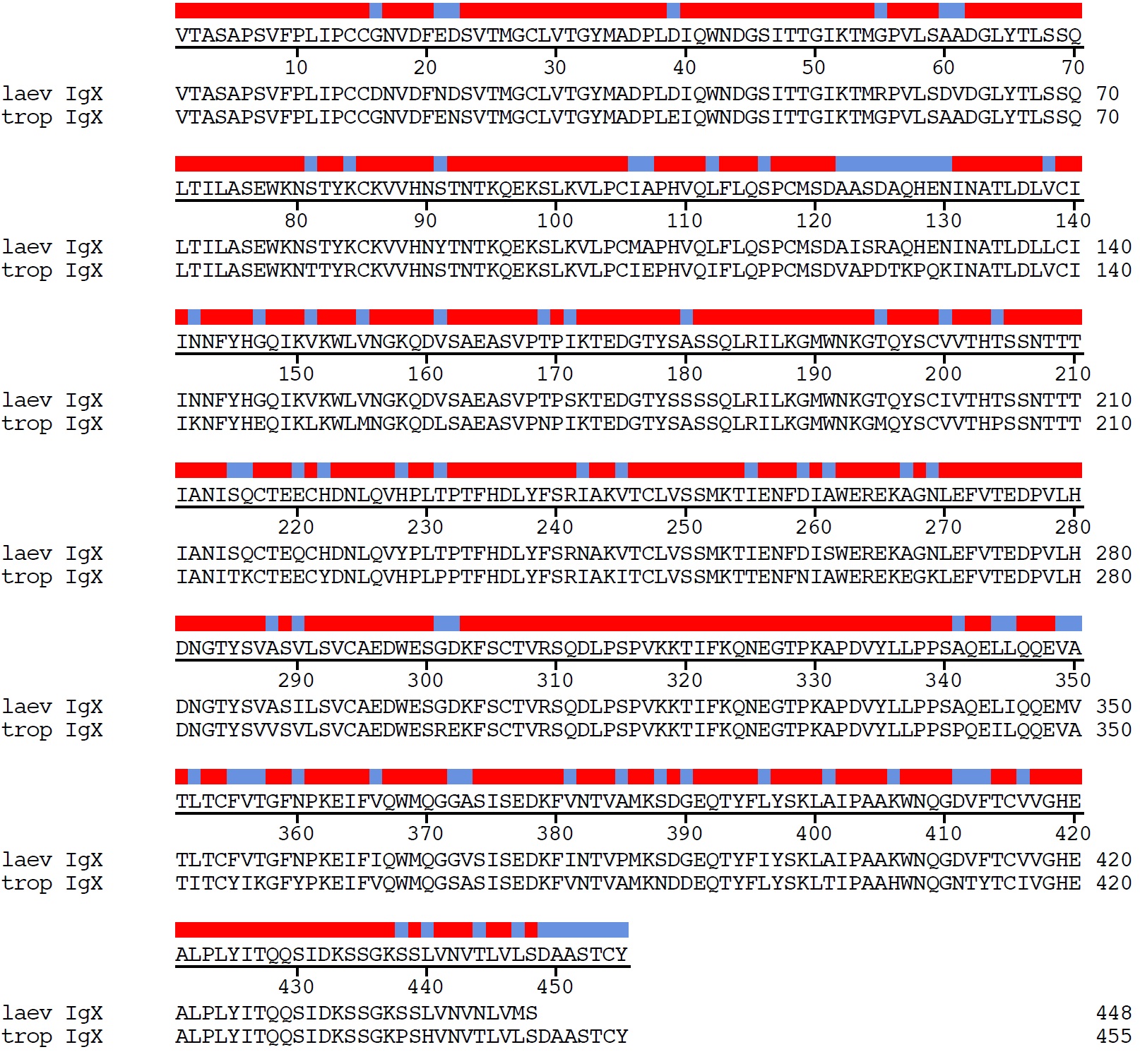 Fig. 7. Sequence alignment of the IgX heavy-chain constant region in X. tropicalis and X. laevis. The alignment was performed by using the ClustalW method in MegAlign (DNASTAR). Trop, X. tropicalis; Laev, X. laevis.