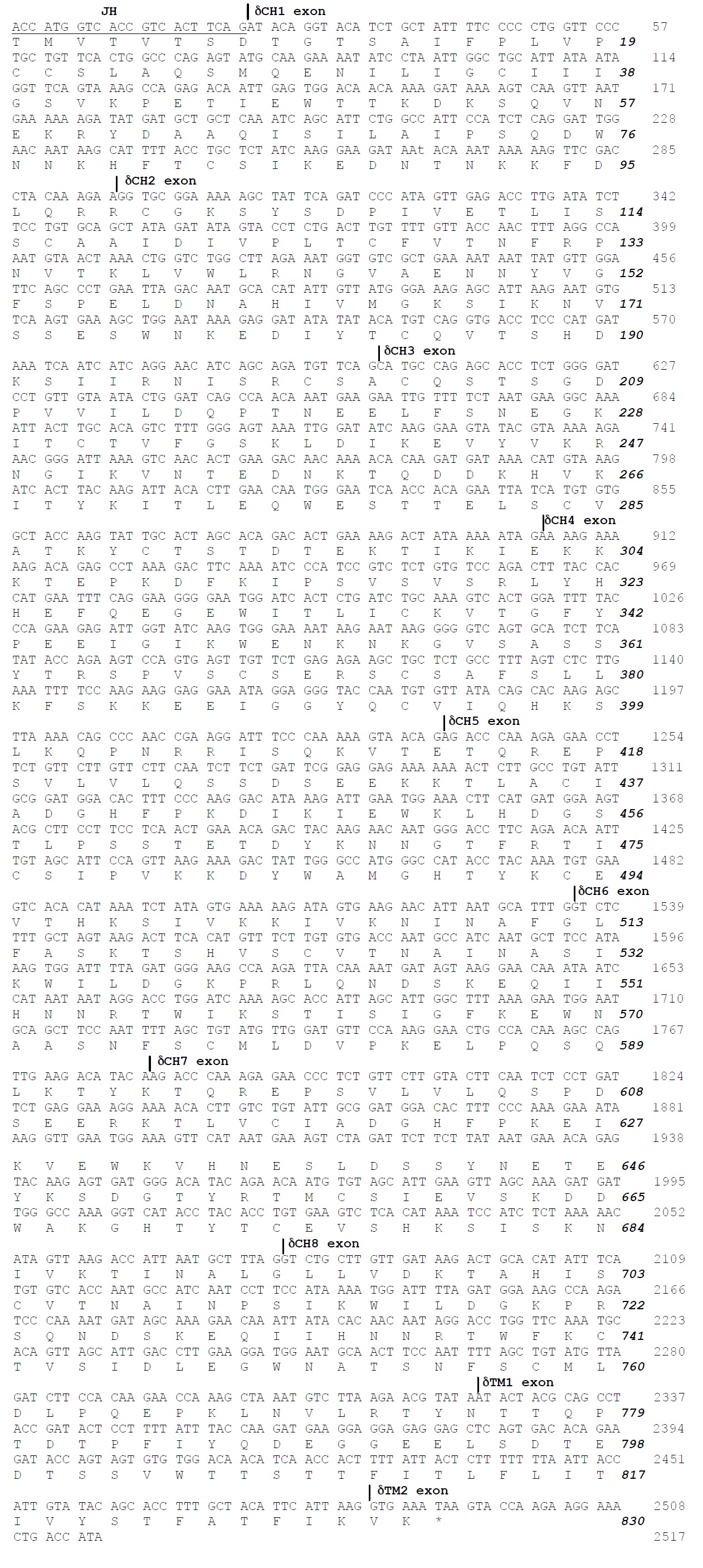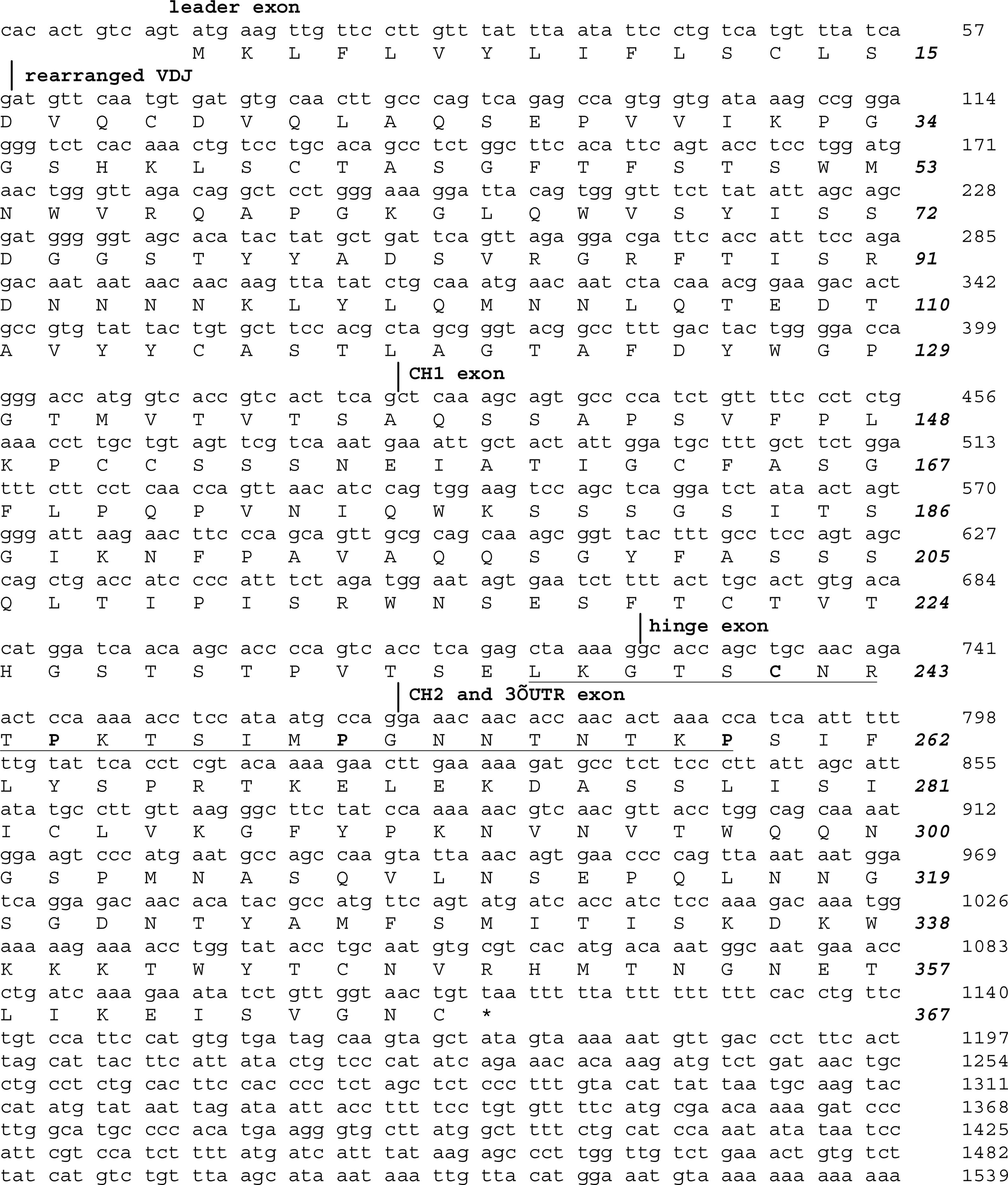 Fig. 11. Nucleotide and the deduced amino acid sequences of an IgF cDNA (GenBank accession no. BC087793). Leader, leader peptide; VDJ, rearranged variable region. The hinge, including segments encoded within CH1 and CH2 exons, is underlined. The cysteine and prolines are in bold. |