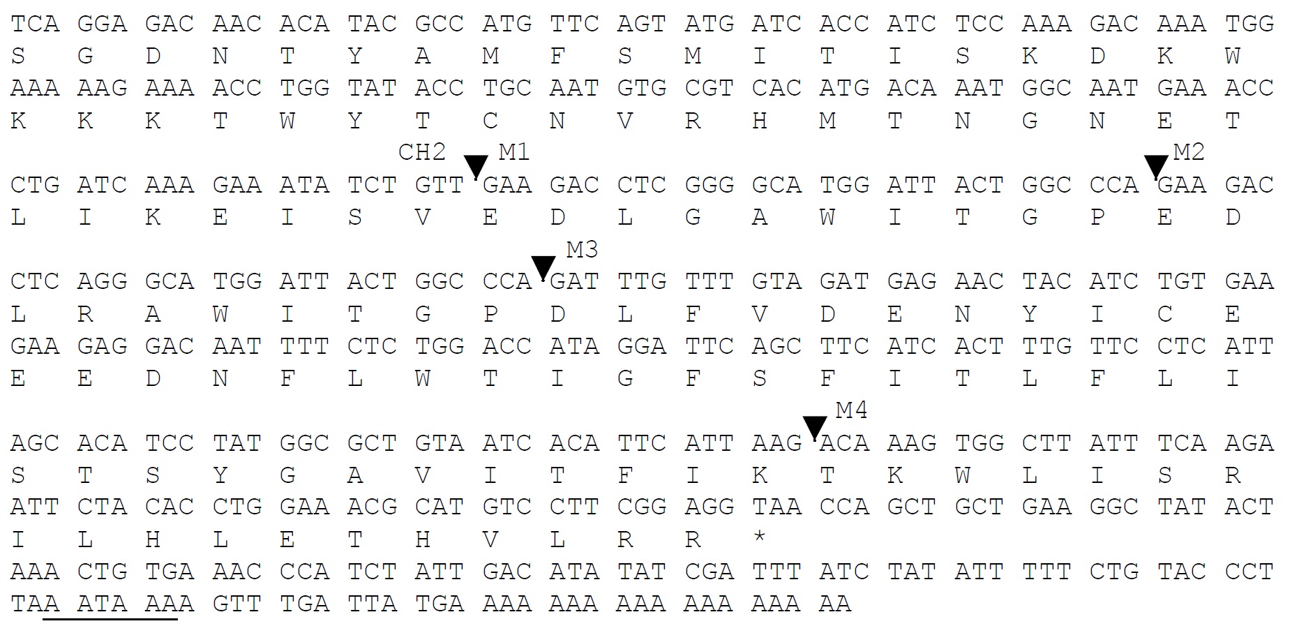 Fig. 12. Sequence of the membrane-bound form of IgF. Stop codons are indicated by inverted filled triangles; the poly(A) addition signal is underlined. CH2, second constant region domain; M1–4, exons encoding the transmembrane region and the cytoplasmic tail.