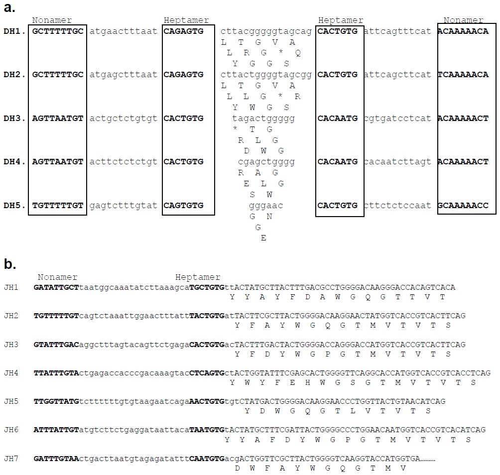 Fig. 14. DH (a) and JH (b) gene segments in X. tropicalis. Recombination sequence signals, including nonamers and heptamers, are in bold.