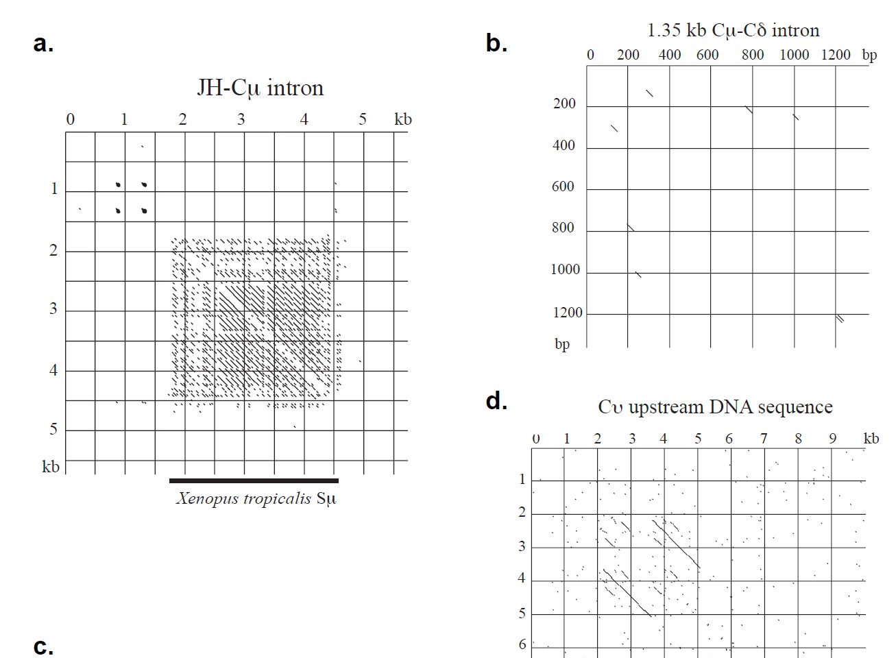 Fig. 15. Dotplot analysis of the JH–Cm intron sequence. Sequence comparison was carried out by using the one-pair dotplot of MegAlign (DNASTAR). The JH–Cm intron was analyzed by using the following parameters: percentage, 80%; window, 30; minimum quality, 1. The parameters used for all of the other sequences were: percentage, 65%; window, 30; minimum quality, 1.