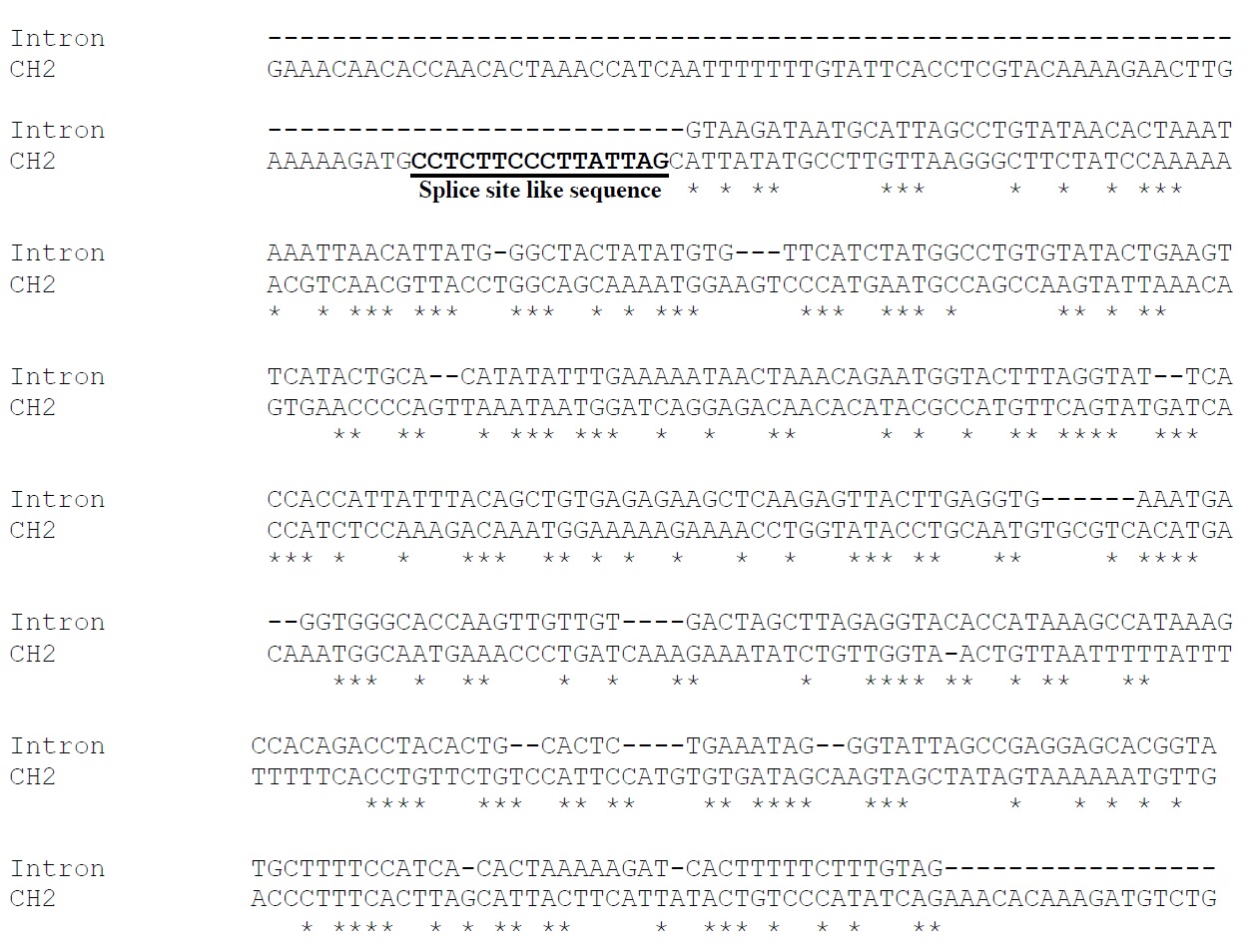 Fig. 16. Sequence comparison of the IgF hinge–CH2 intron and the CH2 exon.
