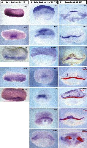 Fig. 2. Gene expression in the explant. (A) Mix2, xnr3, cerberus, xwnt8, and sox17a gene expression in explants immediately after isolation from the early gastrulaembryo. (B) Xk81, otx2, neural-specific tubulin, xslit, chordin, and xwnt8 gene expression patterns in explants cultured to the equivalent of the mid-late gastrula stage (approximately stages 12â14). (C) Xrx, xslit, chordin, slug, neural-specific tubulin, sonic hedgehog, xmsr gene expression at the equivalent tadpole stage (stages 25 â 28). Immunolocalization of tor70 (marking differentiated notochord) is shown in red accompanying slug, neural-specific tubulin, and sonic hedgehog. Immunolocalization of 12/101 (marking differentiated somitic mesoderm) is shown in red accompanying the xmsr gene expression pattern. All views are en face with the same orientation of animal up, vegetal down, and lateral on either side of the midline.